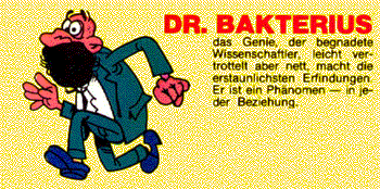 zur seite stehen im seine kollegen dr. tanlan und dr. verraffa die ihre meiste zeit damit verbringen, dr. bakterius verlegte oder verlorengegangene formeln wieder zu finden. in seinem geheimlabor werden die unterschiedlichsten experimente durchgeführt. in anbetracht der tatsache, dass keine rücksicht auf ethische und moralische bedenken genommen werden, wird sogar vor tierexperimenten nicht zurückgeschreckt. von seinen assistentinnen gequälte hunde und fliegen die bestialisch mit ethanol vergiftetet werden gehören ebenso zum grausamen laboralltag wie außerirdische suppenhühner in massentierhaltung. die versuchsergebnisse dieser experimente zeigen nicht immer den gewünschten erfolg und sind manchmal auch unbeabsichtigt, aber aufgrund des enormen zeitdruckes nicht vermeidbar. immer öfter finden jetzt aber auch proteste von versuchsgegnern statt und uebergriffe auf dr. bakterius und sein team sind an der tagesordnung. deshalb werden auch keine kosten und mühen gescheut alternative forschungsorte und therapieformen für die versuche zu finden. dazu gehört sein unterwasserlabor und seine musiktherapie mit feinster gitarrenmusik à la "LAOGREEN". für weitere anregungen und proteste (die sowieso nicht beachtet werden) mailen sie bitte cbeck2@ix.urz.uni-heidelberg.de